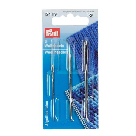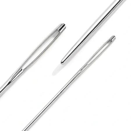 Zestaw trzech igieł o specjalnym tępym czubku, które są przeznaczone do szycia i haftowania włóczką. Wykonane zostały ze stali nierdzewnej, posiadają duże oko umożliwiające stosowanie średniej i grubej wełny, a także np. sznurków.
