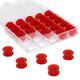 Czerwone szpulki na spodnią nitkę do domowej maszyny do szycia. Szyjąc na maszynie używa się dwóch nici określanych jako górną oraz spodnią. Nitkę górną ustawia się na przeznaczonym dla niej trzpieniu, a następnie prowadzi nitkę przez wszystkie wskazane punkty aż po samą igłę. Spodnią szpulkę z kolei wkłada się do maszyny na małych plastikowych szpulkach dołączonych do maszyny. W pierwszej kolejności należy przewinąć (naszpulować) nitkę z dużej szpulki nici na małe plastikowe szpulki. Następnie szpulkę można umieścić w mechanizmach maszyny. Im więcej kolorów używasz podczas szycia, tym większy zapas szpulek będzie przydatny dla komfortowej pracy. Gdy zabraknie Ci szpulek, którąś z nitek trzeba będzie odwinąć by zwolnić szpulkę dla nowego koloru - to prosty sposób na zmarnowanie nici, dlatego warto zawsze mieć pod ręką kilka zapasowych, wolnych szpulek