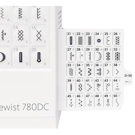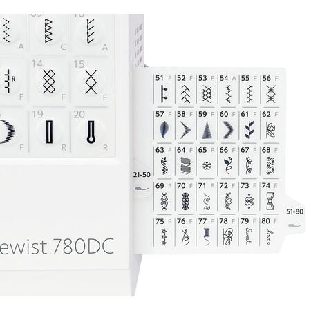 - 80 dostępnych programów ściegowych, w tym ściegi proste, zygzak, elastyczne, owerlokowe, kryte, satynowe, ozdobne i dziurki