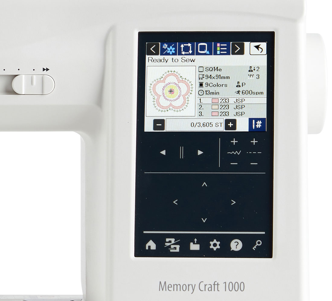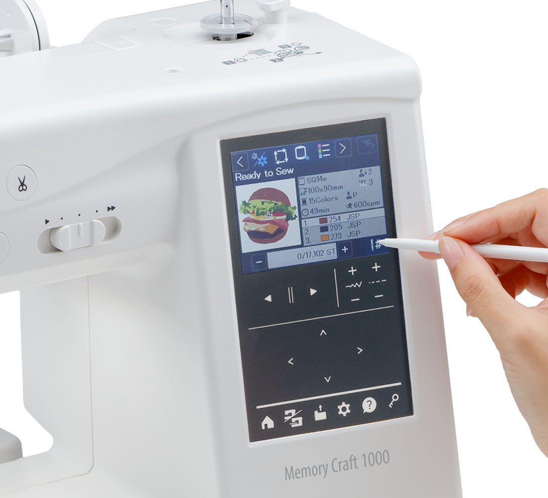 - Duży, czytelny dotykowy wyświetlacz, prezentujący informacje o hafcie: ilość wkłuć, wymiary wzoru,ilość kolorów, prędkości haftowania, a także czas potrzebny na wykonanie haftu