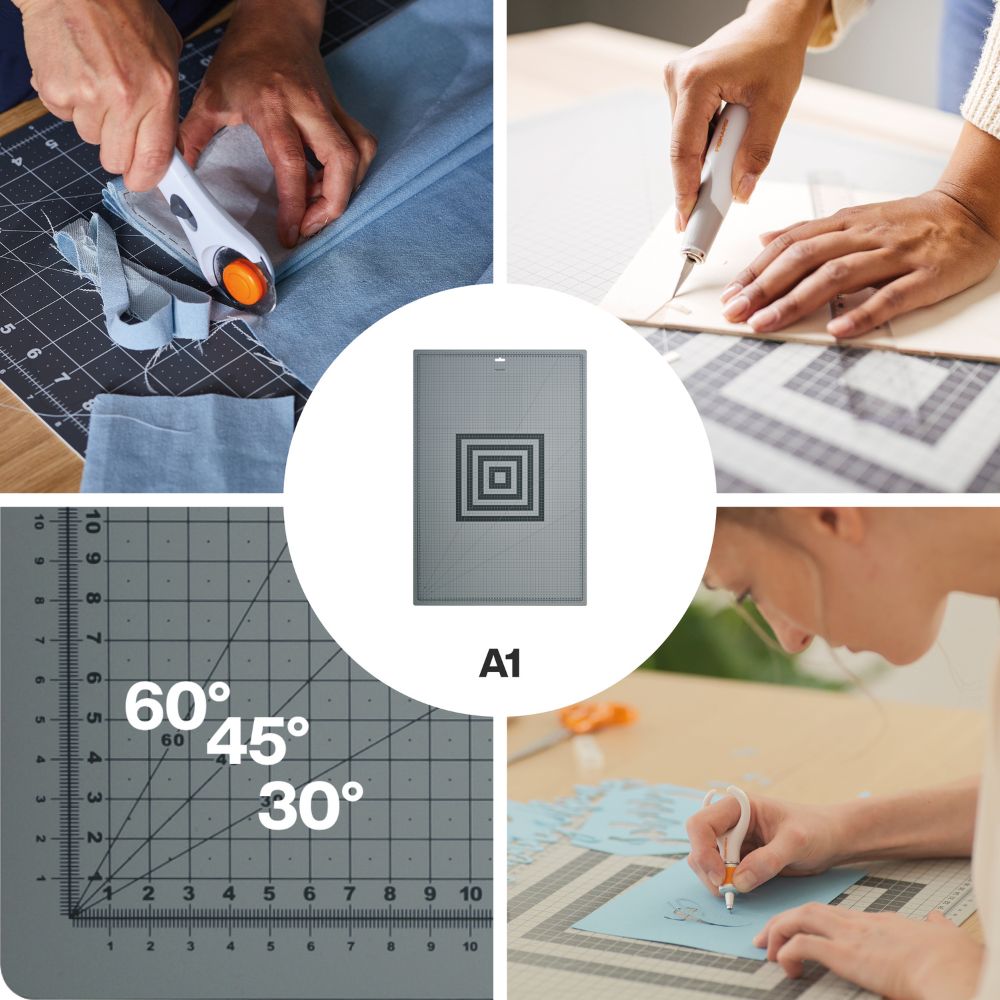 Duża, wytrzymała, dwustronna mata podkładowa (szara). Idealnie nadaję do cięcia na niej różnych surowców (tkanin, tektury, skóry, papieru itp) nożami krążkowymi, rękodzielniczymi, skalpelami itp. Mata chroni blat stołu oraz ostrze noża przed uszkodzeniem. Mata jest samoregenerująca, dzięki czemu po wykonaniu nacięcia zasklepia się. Powierzchnia maty jest delikatnie porowata, dzięki czemu krojony materiał dobrze na niej leży, nie przesuwa się podczas krojenia.