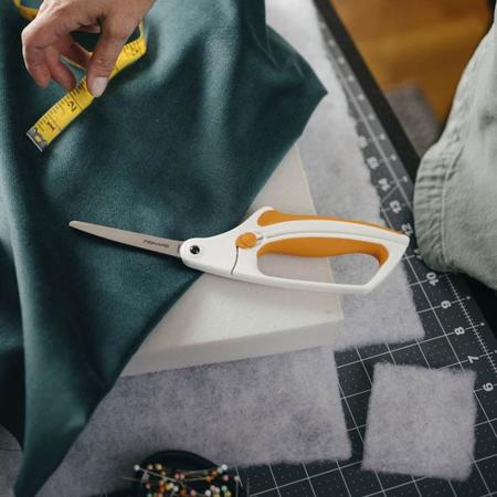 Nowoczesne nożyce z mechanizmem sprężynowy Easy Action™, który sprawia, że nożyce otwierają się samoczynnie - każdorazowo po wykonaniu cięcia. Dzięki temu praca przebiega szybciej i wygodniej, niż w przypadku cięcia standardowymi nożycami. Dodatkowo komfort pracy poprawia szeroki, dopasowany do dłoni uchwyt pokryty powłoką Softouch®. Długie ostrza świetnie spisują się w trudnych pracach szwalniczych czy biurowych, są idealne do cięcia materiałów, prac patchworkowych czy cięcia papieru. Ostrza wykonane z wysokiej klasy stali nierdzewnej zapewniają nożycom długą żywotność. Nożyczki z powodzeniem można ostrzyć, polecamy ostrzałki Fiskars.