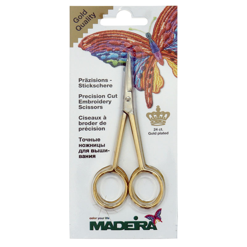 Nożyczki do nitek Madeira wykonane są ze stali nierdzewnej i pozłacane 24 karatowym złotem, co zapewnia im trwałość i wytrzymałość przez wiele lat użytkowania. Ostrza nożyczek są bardzo ostre, gwarantują szybkie i precyzyjne cięcie.