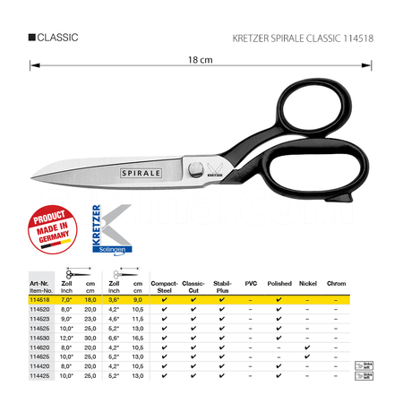 Wykonane ze specjalnej kutej stali nożyce Kretzer Spirale Classic 114518 posiadają klasyczny, ostry szlif zapewniający łatwe i precyzyjne krojenie zróżnicowanych materiałów. W środkowej części znajduje się śruba regulująca docisk ostrzy. Dobrze wyprofilowane stalowe uchwyty sprawiają, że nożyczki wygodnie i pewnie leżą w dłoni. W naszym sklepie znajdziesz te nożyczki w kilku rozmiarach - ten egzemplarz to nożyczki o całkowitej długości około 18 cm, najmniejsze spośród dostępnych, a co za tym idzie również najlżejsze. Co istotne, rękojeść jest wyprofilowana w taki sposób, że są to nożyczki dla osób praworęcznych