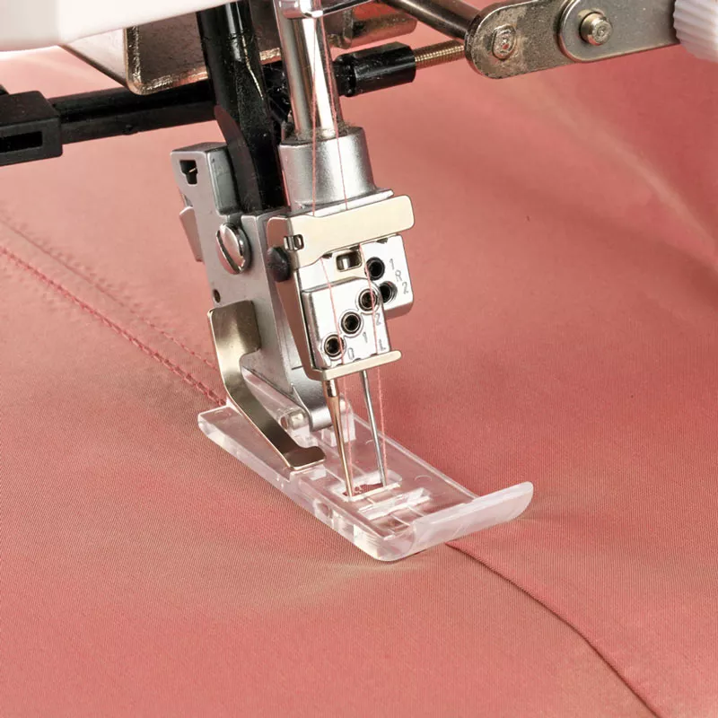Ten prowadnik, używany razem ze specjalną stopką (Janome nr 200804101), umożliwia precyzyjne przeszycia wzmacniające na prawej stronie materiału. Ułatwia tworzenie estetycznych szwów dekoracyjnych oraz wzmacniających, które znajdziemy m.in. w odzieży sportowej i casualowej. Idealny do profesjonalnych wykończeń i zwiększenia trwałości gotowego produktu.