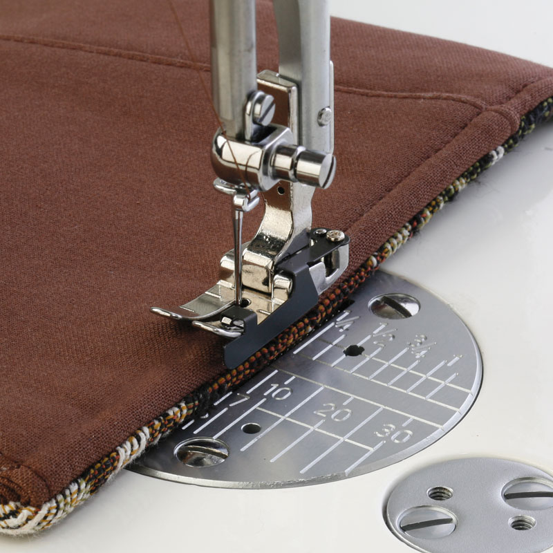 Dodatkowo, na stopce umieszczono poziome znaczniki, które pomagają w idealnym momencie obrócić materiał na igle, aby po zmianie kierunku utrzymać dokładny odstęp od krawędzi.