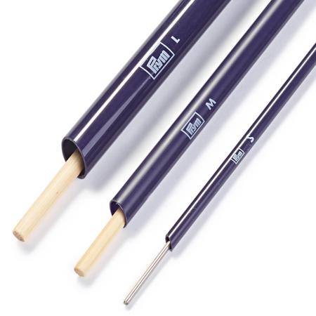 Ułatwia wywracanie na drugą stronę wąskich elementów takich jak paski, szlufki, rączki toreb itp. Nałóż materiał na plastikową rurkę, a następnie stopniowo przepychaj go dołączoną metalową (S)/drewnianą (M, L) pałeczką na drugą stronę.